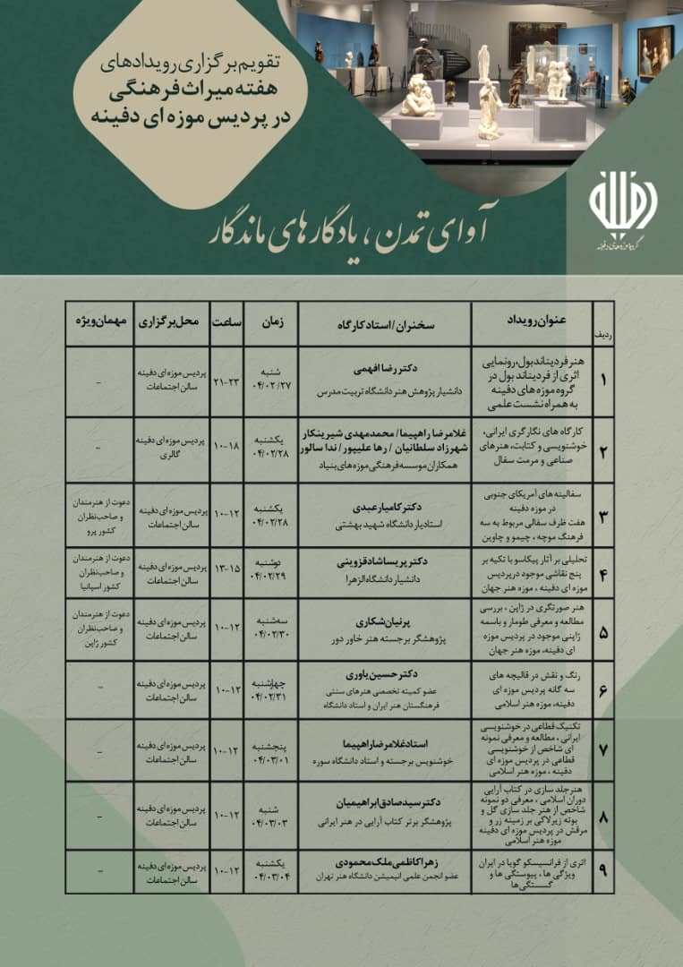 به گزارش روابط عمومی موسسه فرهنگی موزهها به مناسبت گرامیداشت هفته میراث فرهنگی، موسسه فرهنگی موزهها سلسله نشستهای علمی و فرهنگی با شعار آوای تمدن، یادگارهای ماندگار را برگزار میکند. این نشستها که از ۲۸ اردیبهشت تا ۴خرداد درپردیس موزهای دفینه برگزار میشود، به بررسی ابعاد مختلف میراث فرهنگی ایران از منظرهای مختلف تاریخی، باستانشناسی و هنری میپردازد.