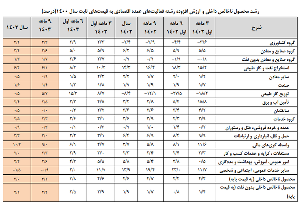 نتایج مذکور حاکی از آن است که در سال ۱۴۰۳ رشته فعالیتهای گروه کشاورزی رشد ۳.۲ درصد، گروه صنایع و معادن ۳.۴ درصد (شامل: استخراج نفت و گاز طبیعی ۶.۲، سایر معادن ۰.۵، صنعت ۱.۶، توزیع گاز طبیعی ۰.۵، تأمین آب و برق ۲.۴ و ساختمان ۵ درصد) و گروه خدمات ۲.۵ درصد نسبت به سال ۱۴۰۲ رشد داشته است.