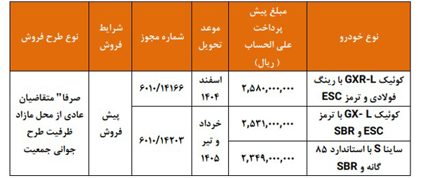 پیشفروش محصولات گروه خودروسازی سایپا ویژه متقاضیان عادی (از محل مازاد ظرفیت طرح حمایت از خانواده و جوانی جمعیت)، از ساعت ۱۰ صبح امروز شنبه ۵ مهرماه آغاز شد و تا زمان تکمیل ظرفیت ادامه خواهد داشت.